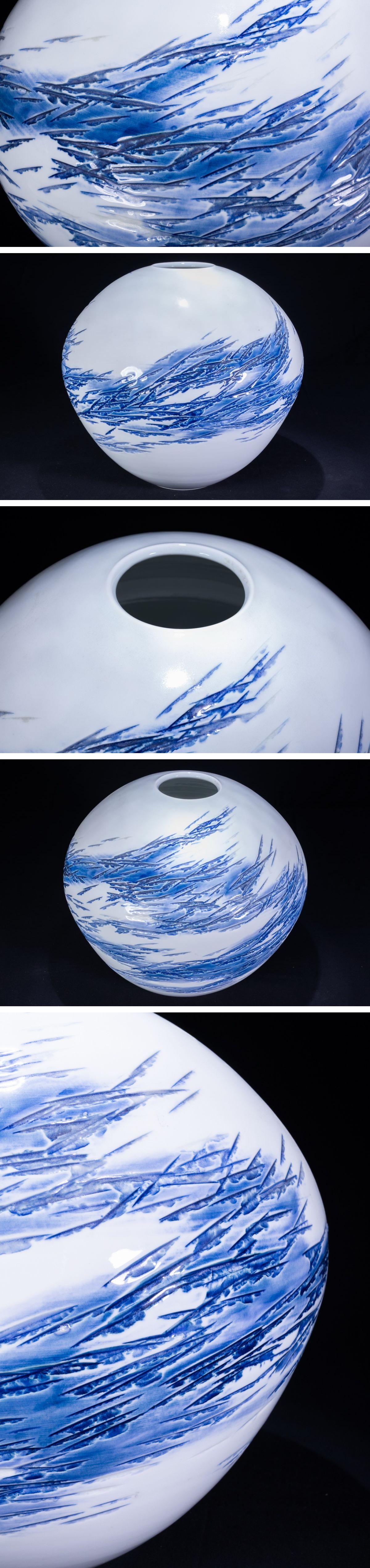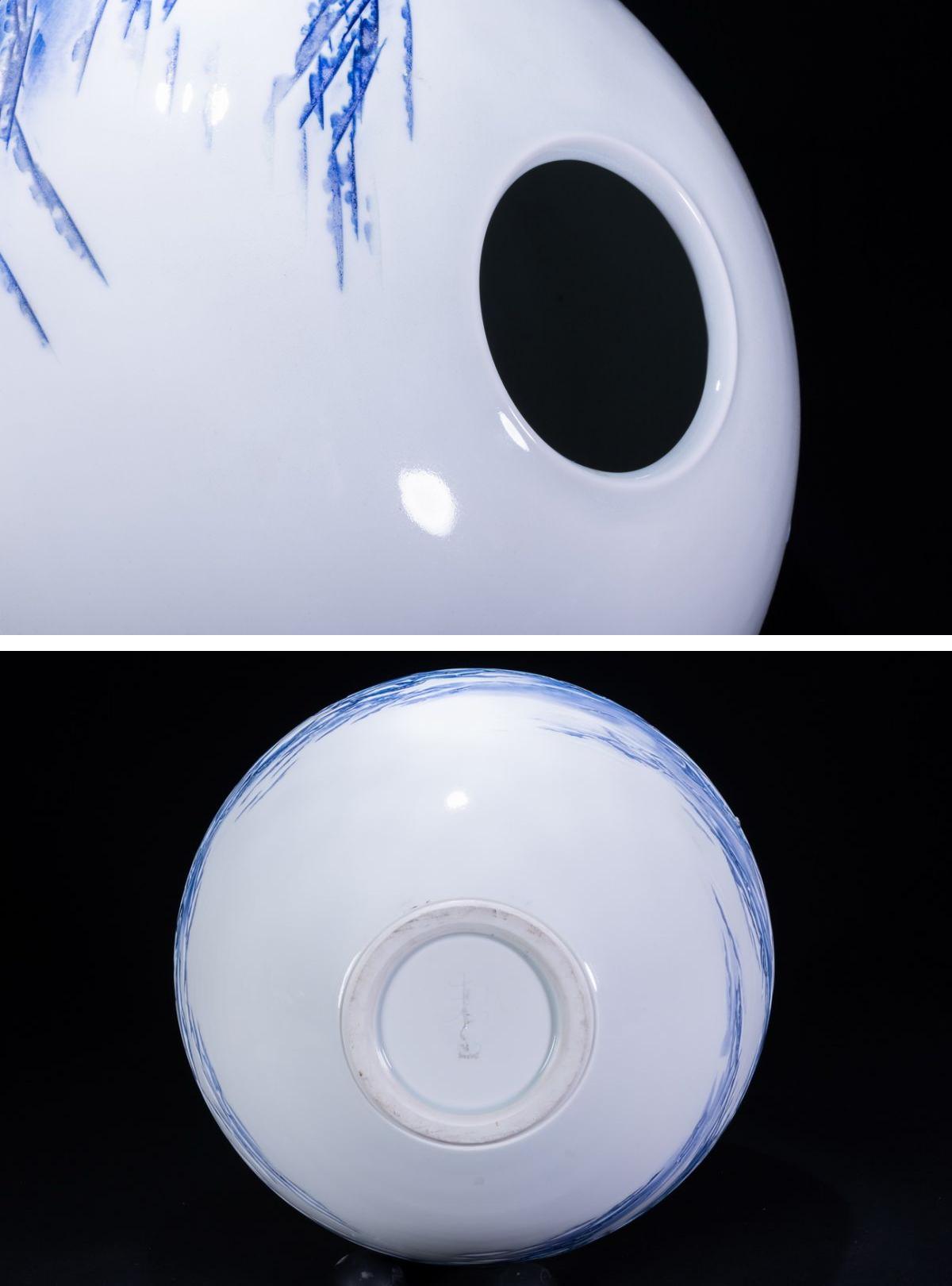 【珍品堂】1円から 藤井朱明 作 染付山水 飾壺 花瓶 人気作家 時代物 古美術 骨董品 H29.2cm M-A5N-F3 收藏