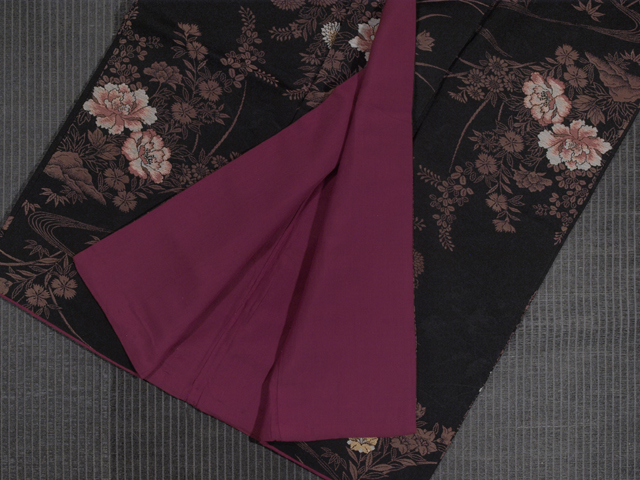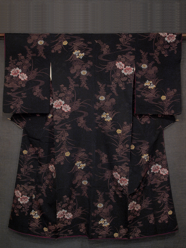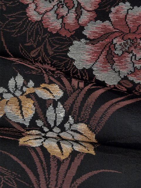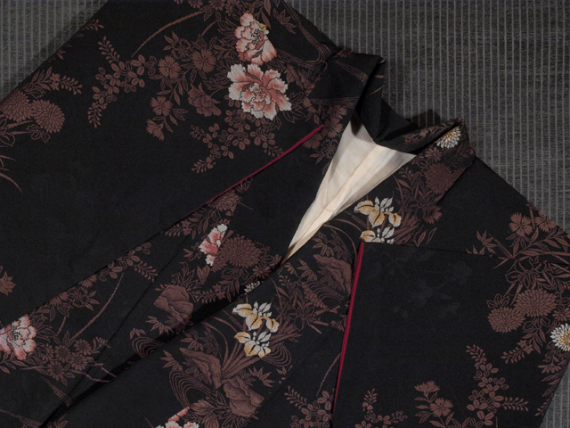 | 詳細 | 黒色の地に、草花の地紋が織り出され、同じように杜若(かきつばた)、桔梗(ききょう)、菊、楓、笹、萩、撫子(なでしこ)などの草花の文様が織り込まれている、お召しです。 昭和初期ごろにつくられたと思われるアンティークのお品です。とても完成度の高い意匠で、格調の高さが感じられます。 胴裏が全体的に黄変気味なほか、左後袖のたもとへりに直径約 1cm の穴が 1 か所あります。こまかなくすみやうすよごれがちらほらと若干ありますが、いずれも目にはつきません。そのほかに目につく大きなしみやよごれ、褪色などのダメージはなく、この時代のものとしてはきれいな状態なので、アンティークにご理解のある方であれば、穴を繕ってお召しになることは可能と思われますが、状態ランク=「D」のご着用対象外、リメイク素材用とさせていただきます。 |