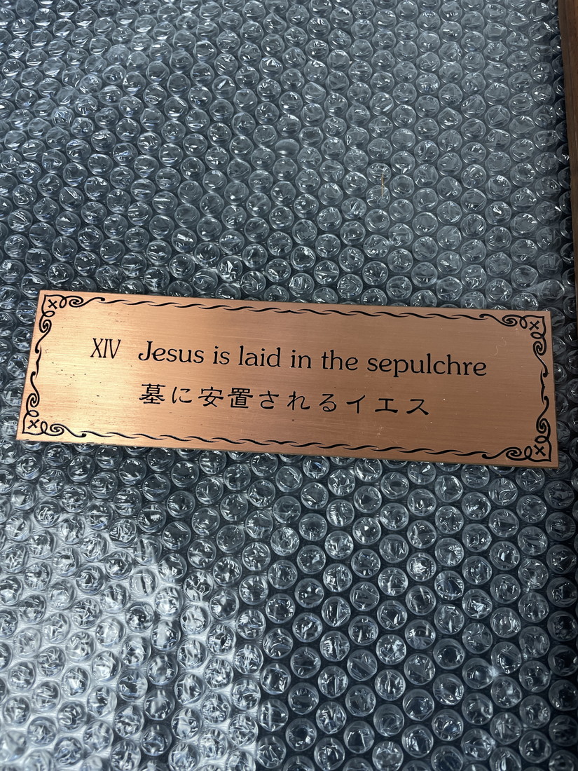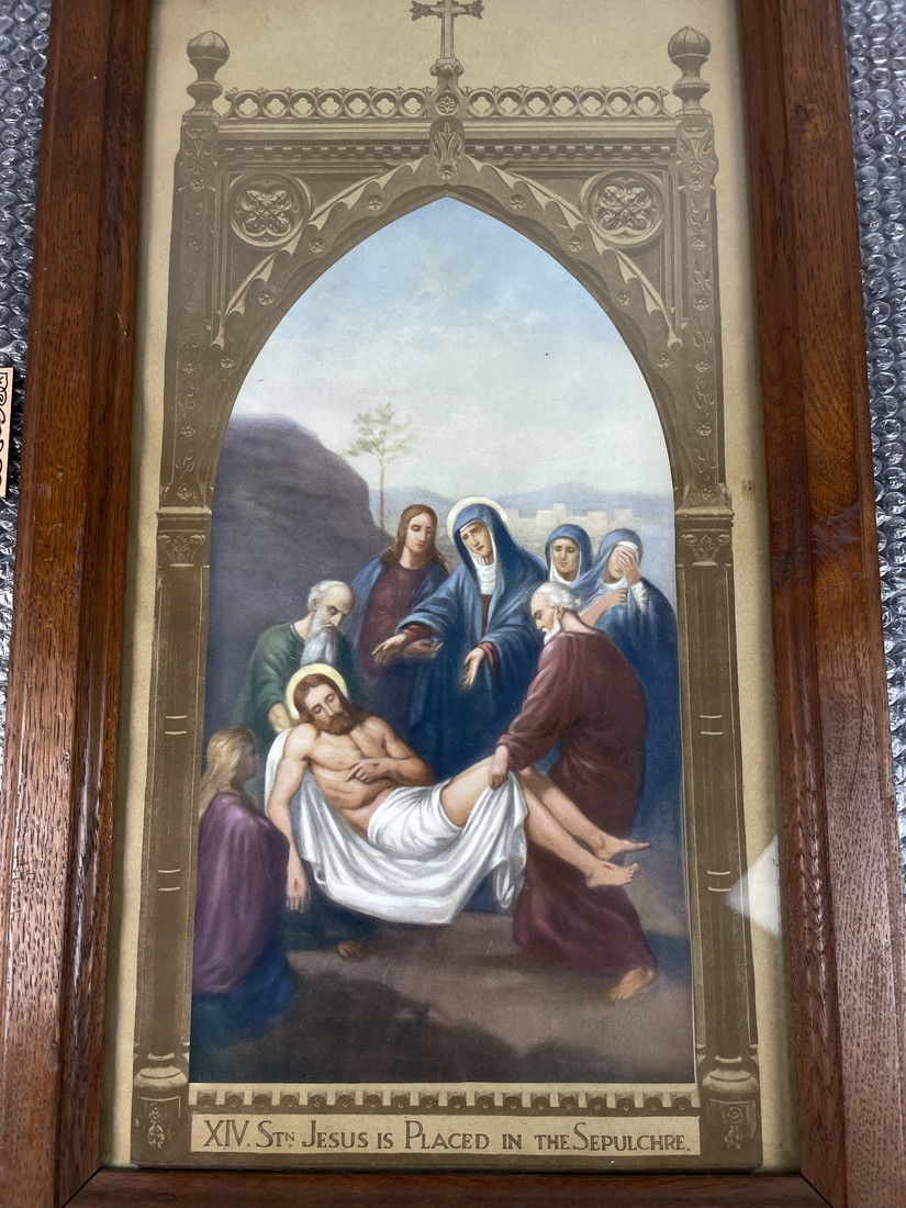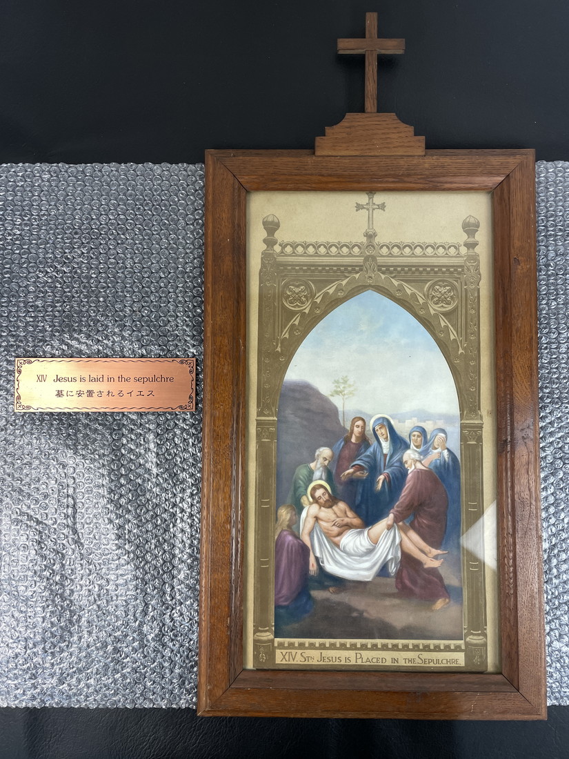 キリスト教 絵画 第14留 墓に安置されるイエス 銅製銘板付 木製フレーム 十字架付 高さ約78cm 宗教美術 壁掛け 額装 管Y2883N 收藏