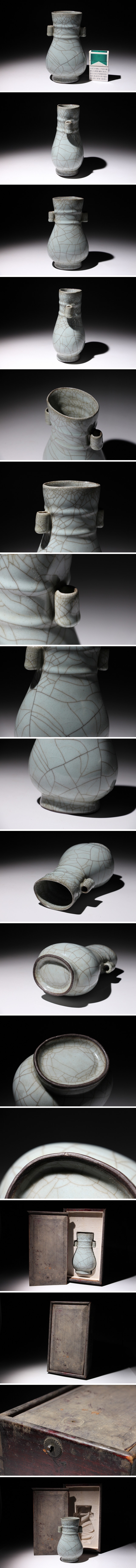 | ◇商品説明◇ | 官窯管耳瓶の出品です。写真の木箱に収まっております。状態につきましては、スレ、キズ、ヨゴレ等がありましたので画像にて御確認の程宜しくお願い致します。木箱の金具が欠損しておりますのでご了承の程宜しくお願い致します。