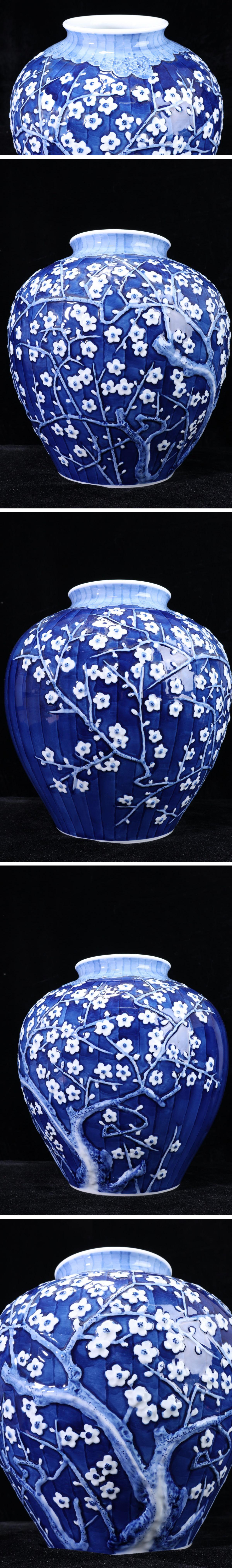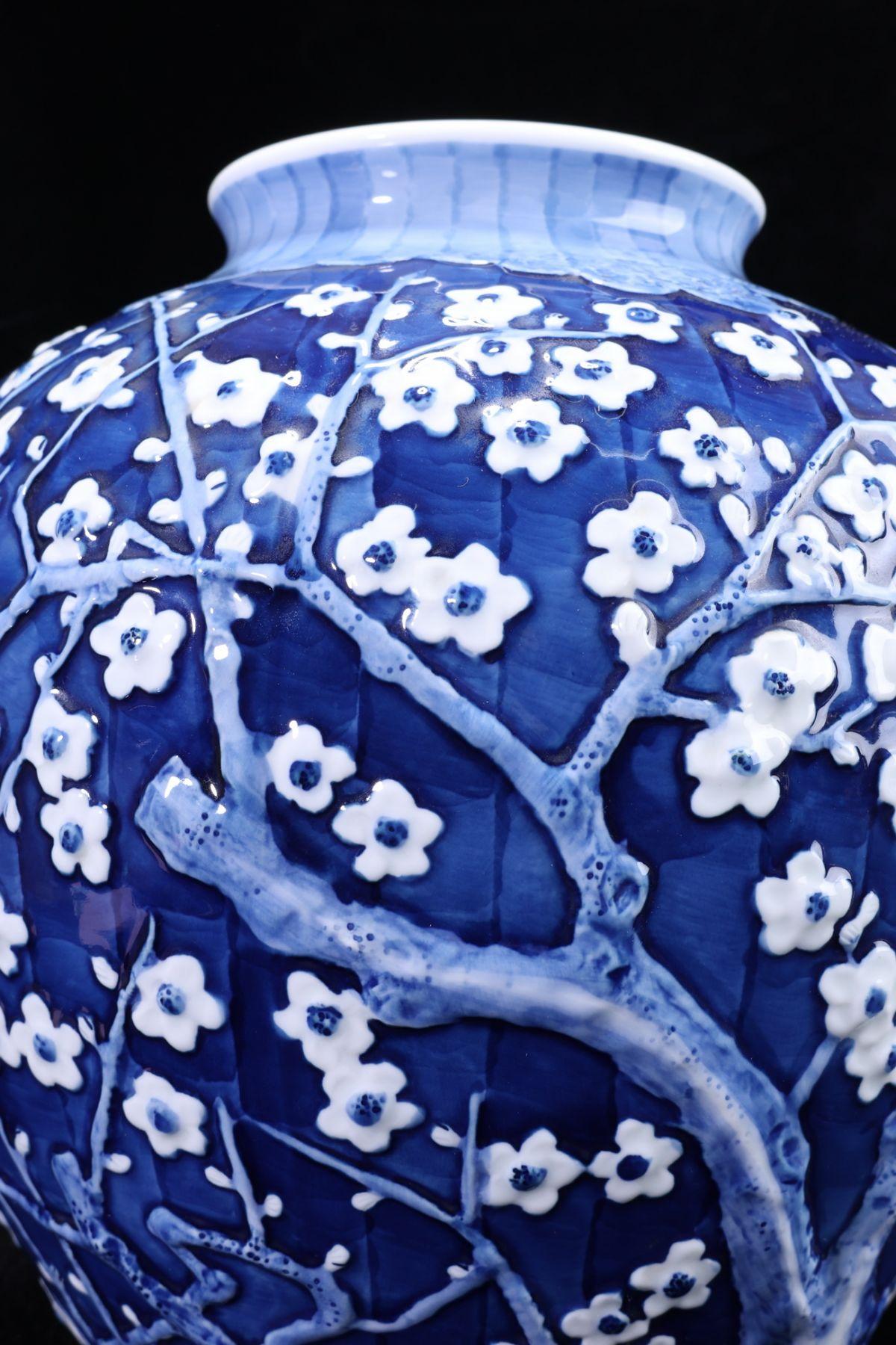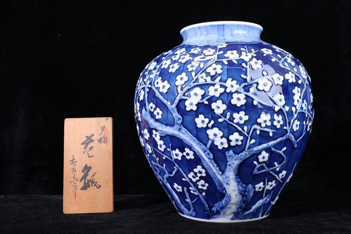 【珍品堂】1円から 有田焼 緒方松右衛門 作 染付夕梅 花瓶 共箱 高30.5cm 木箱 美品 古美術 骨董品 時代物 AC70E-J 收藏