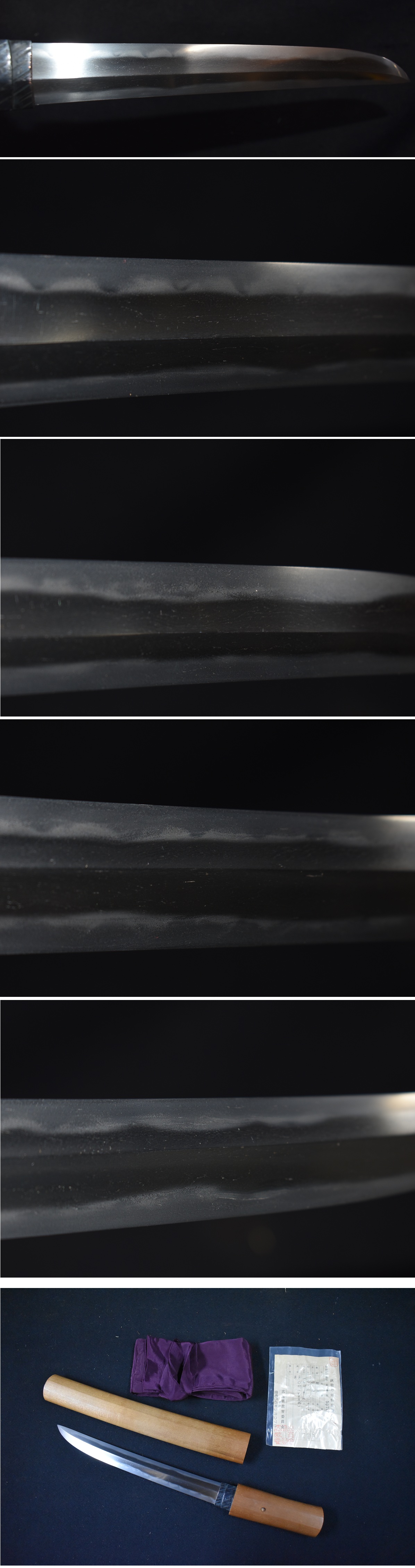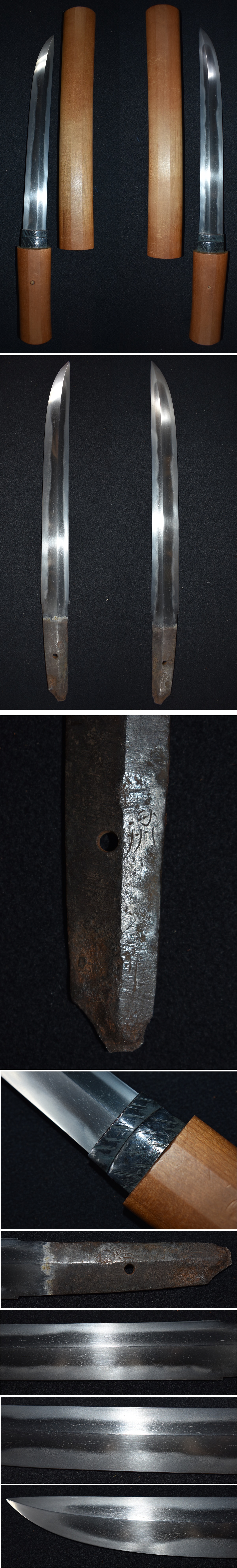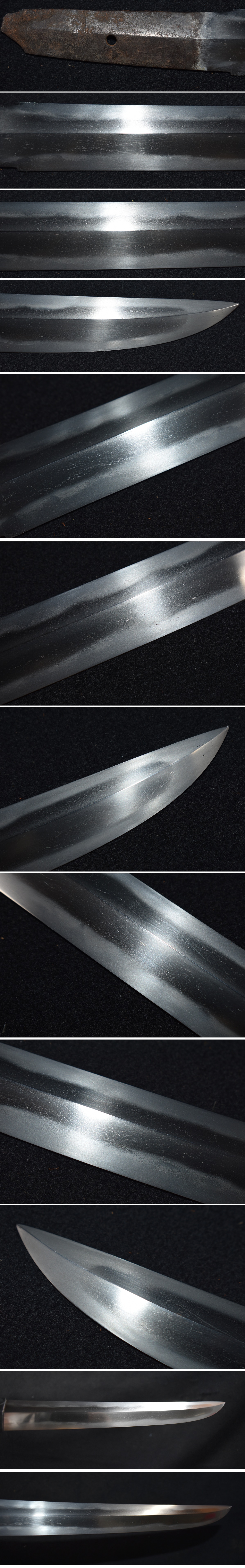 ご覧頂きありがとうございます。今回出品する品は写真の短刀です。 銃砲刀剣類登録証番号 広島県 第50742号 種別 短刀 長さ 24.9センチ 反り 0.2センチ 目くぎ穴 1個 元幅約2.8センチ 元重約0.7センチ 銘文 〇州(以下不明) 大変珍しい両刃(もろ刃)の短刀です。菖蒲造りの棟まで焼き刃がある両刃です。剣としても作られ ていますので、ハバキは二重ハバキのひし形です。両方にもちろん焼き刃があり、刃も付いています ので、どちら側でも切れます。 かなり古い刀身ですので、銘が古くわかりにくいですが、銘はあります。写真でご確認ください。 最上研磨されていますので、とても綺麗です。もちろん錆や刃こぼれやハギレはありません。 乱れ刃紋に金筋や地景が入り、湯走りもあります。見どころある刀身ですので、是非、鑑定に出すのも いいと思います。 大変珍しい造りですので、コレクションにいいと思います。よろしくお願いいたします。 質問は入札前にお願いいたします。わかる範囲でお答えいたします。 発送はゆうパックの着払いです。 ※注意事項※落札しましたら、登録のある教育委員会に所有者変更届(名義変更)を出してください。 よろしくお願いいたします。 |