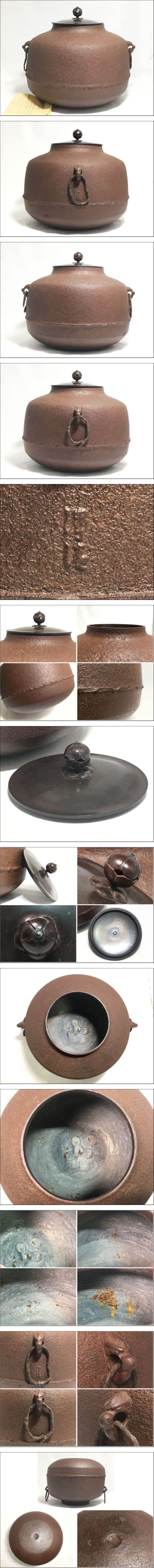 釜師 佐藤浄清 作 撫肩釜 炉釜 茶釜 風炉釜 鉄製 銅蓋 釜鐶 鐶付 約3.8kg 水漏無 茶道具 金属工芸 別箱付 收藏