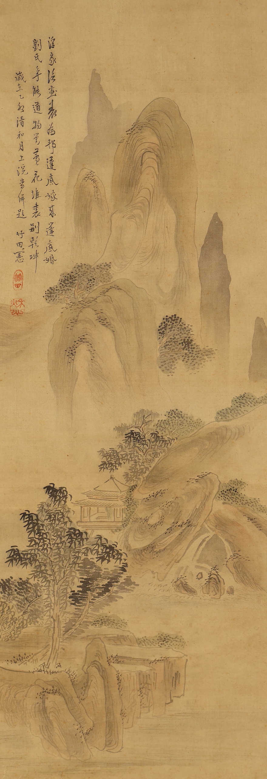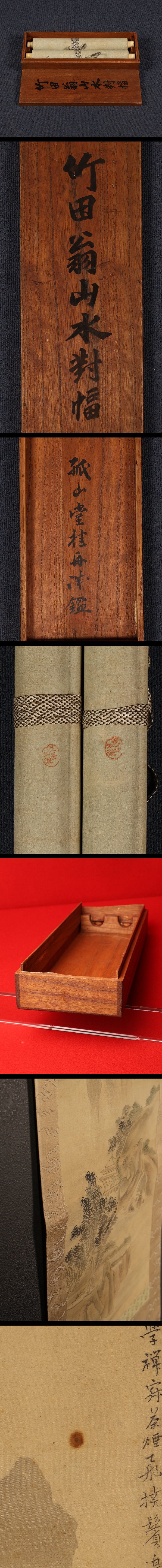 【模写】【伝来】ts2619〈田能村竹田〉双幅 山水画賛 極箱 谷文晁師事 幕末文人画壇 江戸時代後期 大分の人 中国 收藏
