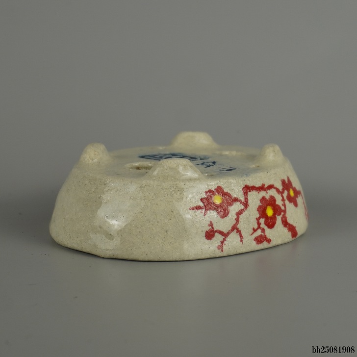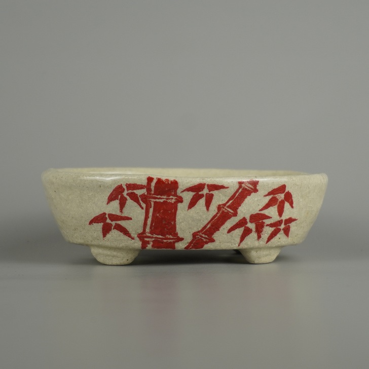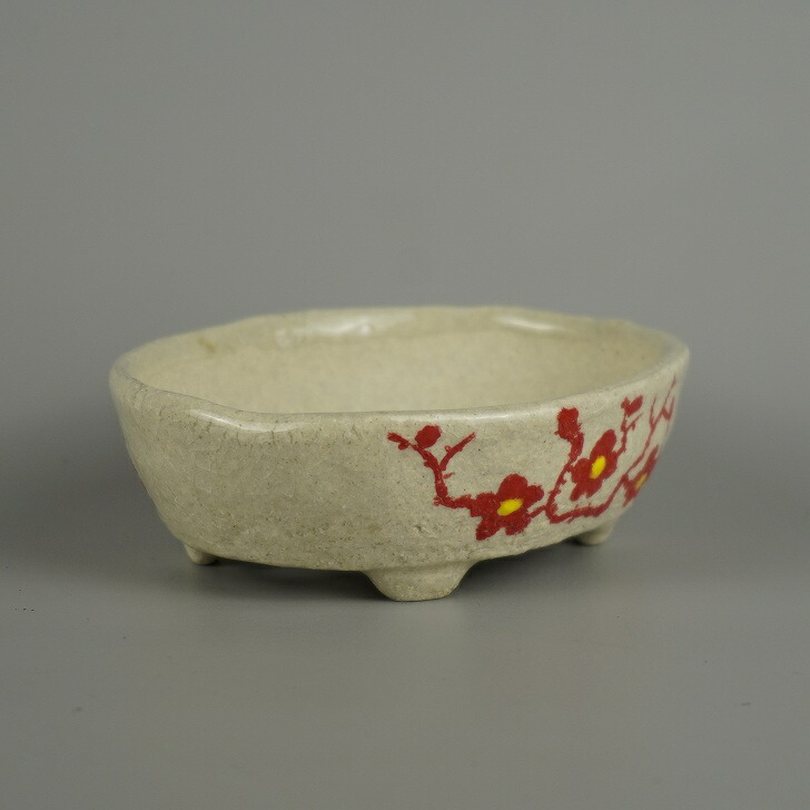 盆栽鉢 越前文山 小型 長辺 約 12.5cm 楕円鉢 赤絵 竹 笹 梅 花 はな ハナ 鑑賞 観賞用 現品 新品 收藏