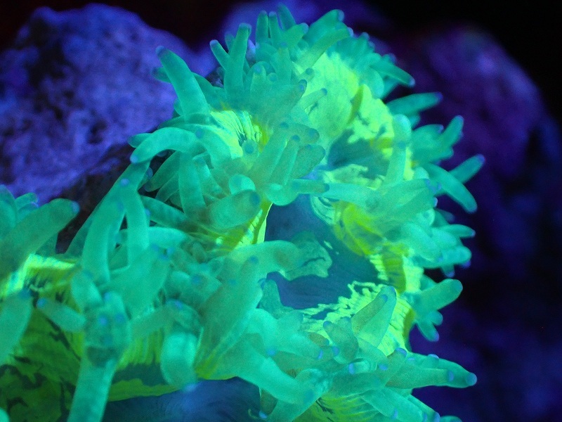 【サンゴ】トランペットコーラル(Metallic Green/ブルーチップ)SMサイズ(個体販売)(±9cm)No.13(生体)