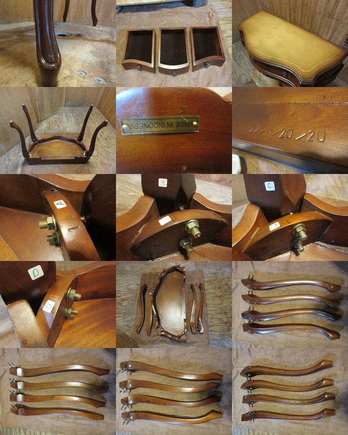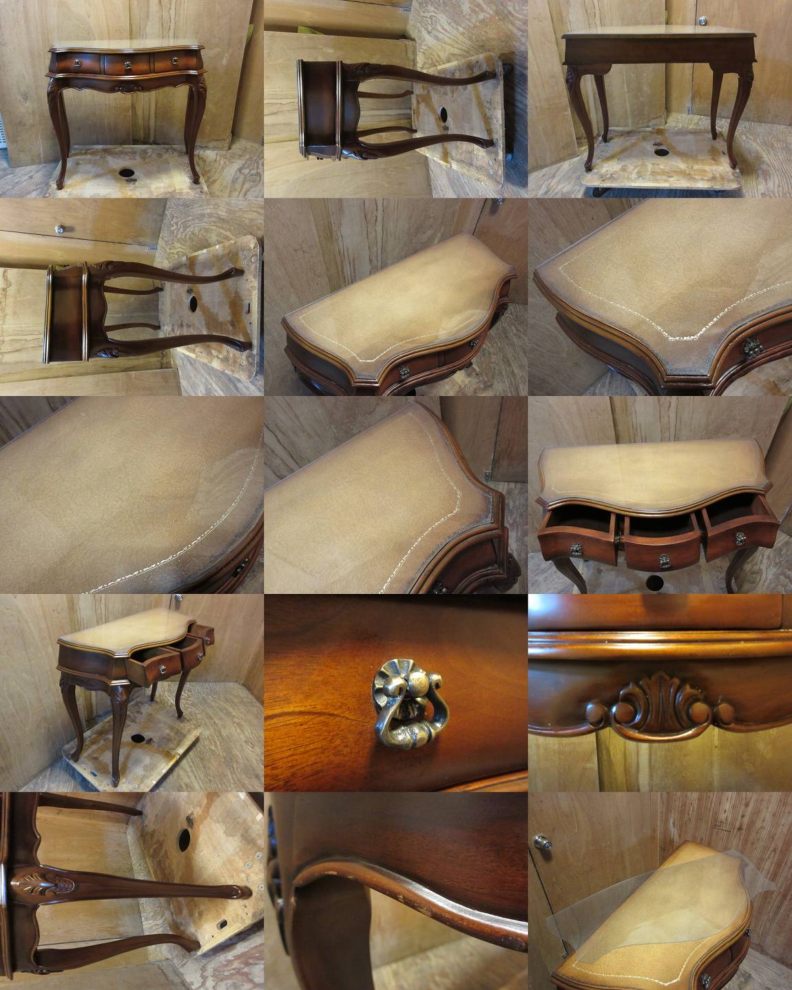 D1495★木製■天板革張りコンソール■猫脚■引出し3か所あり■机■サイドテーブル■MADE INインドネシア■中古品■アンティーク風 收藏