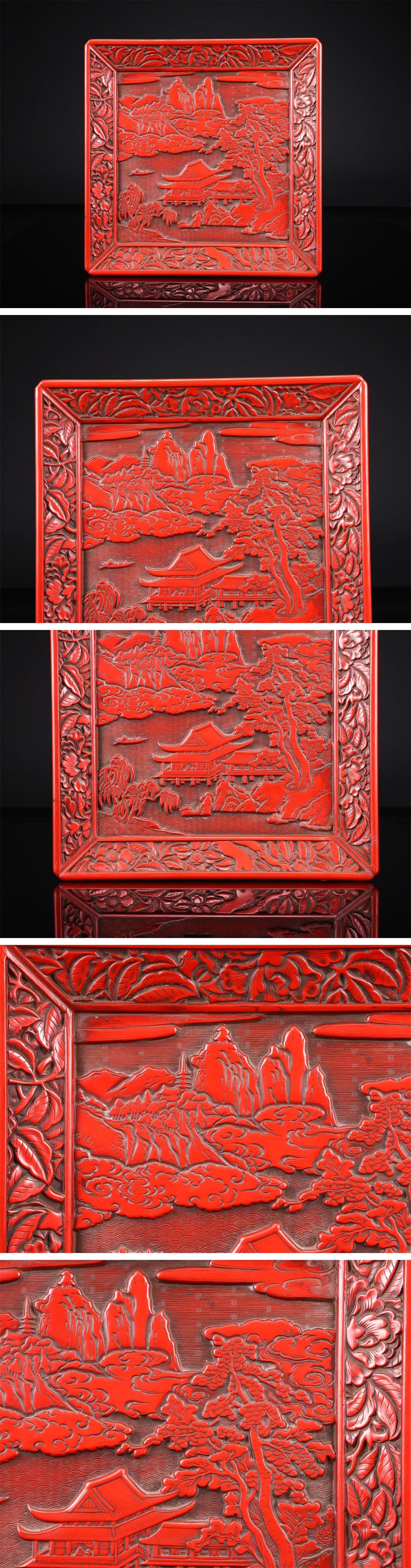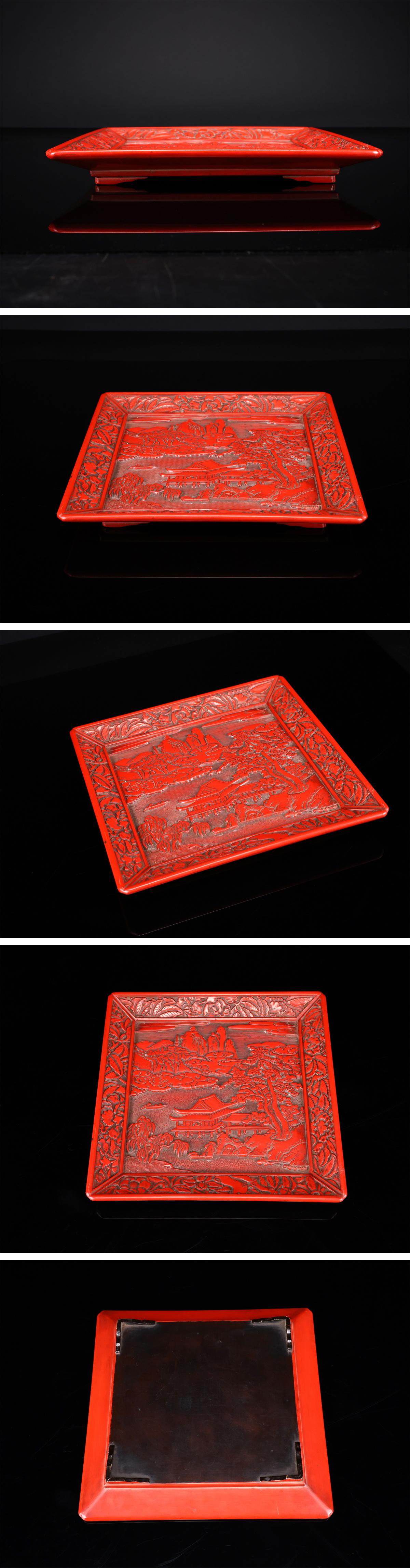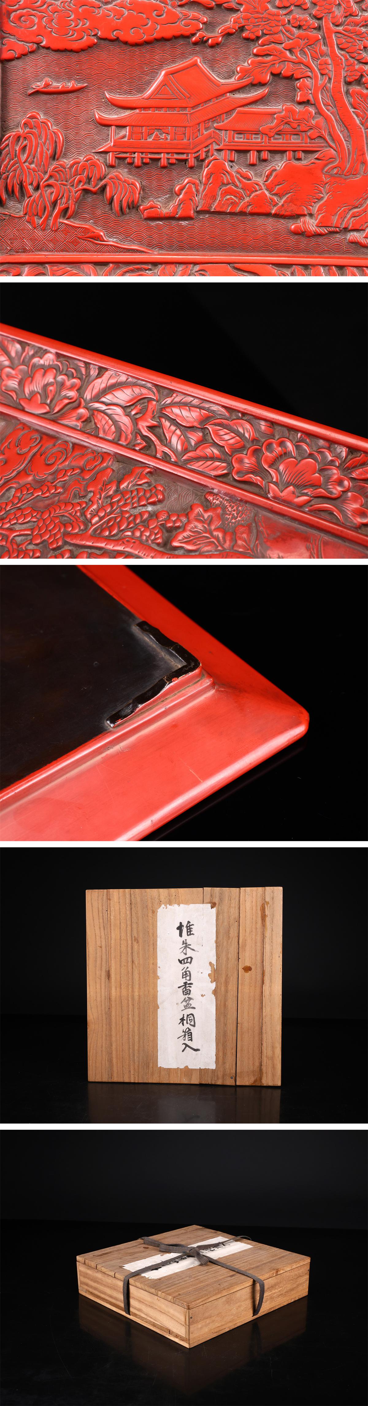 【吉】MB868 唐物 【明代漆芸】 彫漆堆朱山水紋 方皿 幅27㎝/箱付 美品S! 收藏