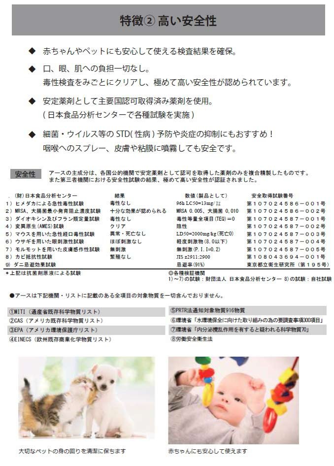 | 成分内容 | ピクアナイド系・ジョードメチルトリルスルフォン ピグアナイド系の安定薬剤を主成分にした複合物で組成されている複合材なので、他の除菌剤と異なり耐性菌の発生を長期間抑制する事ができます。 |