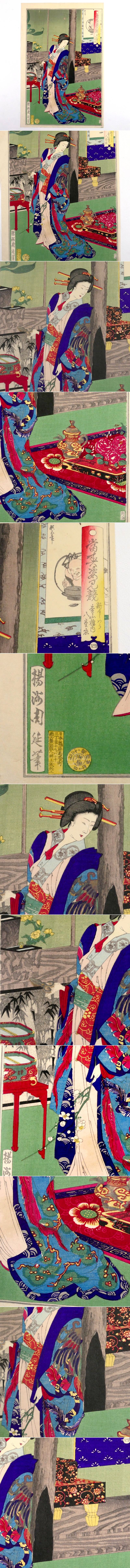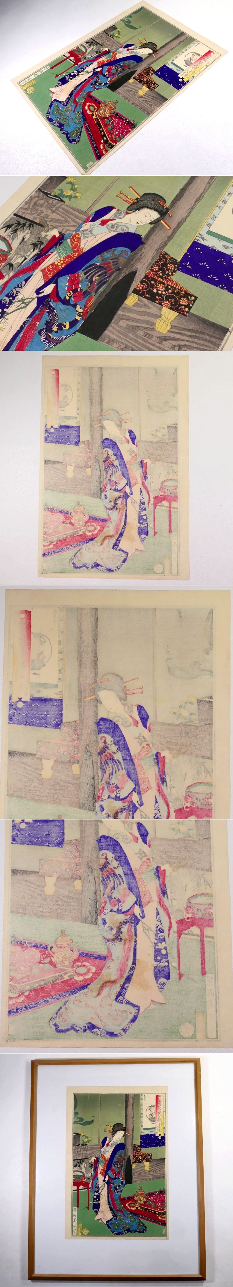 | 商品説明 | ~寸法~ 版画の寸法 縦 約 36.5cm×横 約 24.5cm 額の寸法 縦 約 53cm×横 約 42cm 吉原の美女達の姿を色鮮やかに表現した 「楊洲周延」の人気作「當春姿見競」の一枚 「新よし原 松山楼内 八重衣」です。 現存数の少ない、滅多に出会えない希少な一品と存じます。 この機会をお見逃しなく! 大切にして頂ける方の元へ届けば幸いでございます。 ~状態~ 状態は画像の通りとなります。 経年による破れや多少の汚れくらいはございますが 大きく鑑賞を損なう事はないと思われます。 詳しくは画像にてご確認下さい。 許容範囲内の時代傷みはご理解下さい。 |