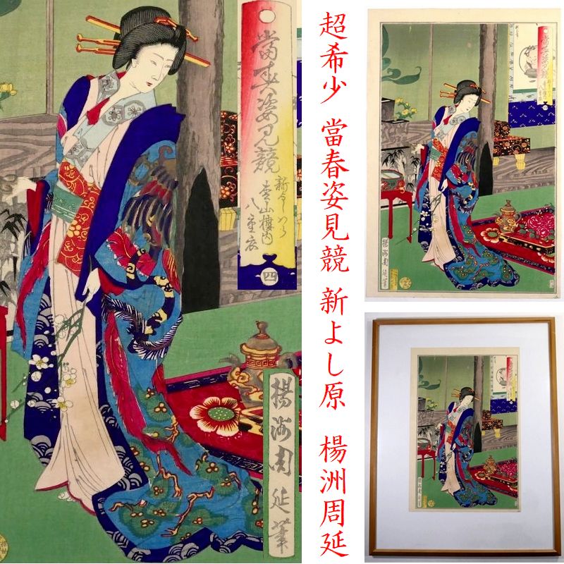 【 恵 #2015】 超希少! 「當春姿見競 新よし原 松山楼内 八重衣」 楊洲周延 木版画 額入 浮世絵 美人画 検:吉原/遊郭/花魁 收藏