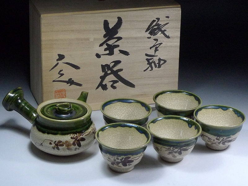 80TR132★煎茶道具 織部焼 加藤六兵衛造 茶器 共箱付 急須 湯?茶碗 5客揃 和食器 湯呑 茶杯 陶磁器 伝統工芸 收藏