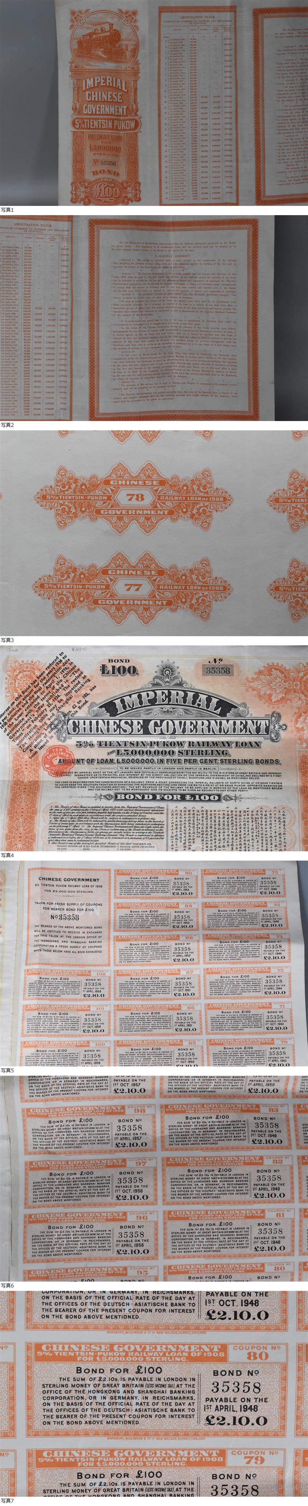 1908 5% Imperial Chinese Government Tientsin Pukow Railway Supplementary Loan 清 鉄道債券 中国 希少 收藏