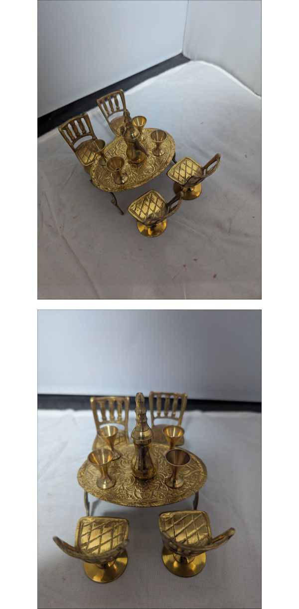 | 商品説明 | 【商品について】 ご覧いただきありがとうございます。 この度出品いたしますのは「 ●真鍮 ミニチュア アンティーク 椅子・ティーセット● 」でございます。 個人所有物の整理のため、出品する運びとなりました。 中古品ではございますが、ご活用いただける方にお譲りできれば幸いです。 商品の状態、付属品、寸法等につきましては、掲載写真にてご確認をお願いいたします。 補足:当方、ペットの飼育および喫煙の習慣はございません。お気にされる方はご参考ください。