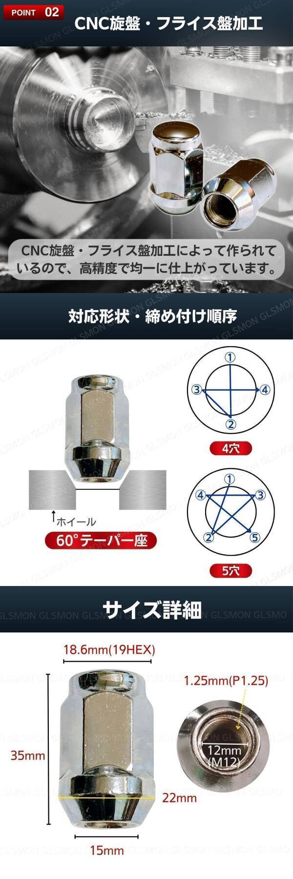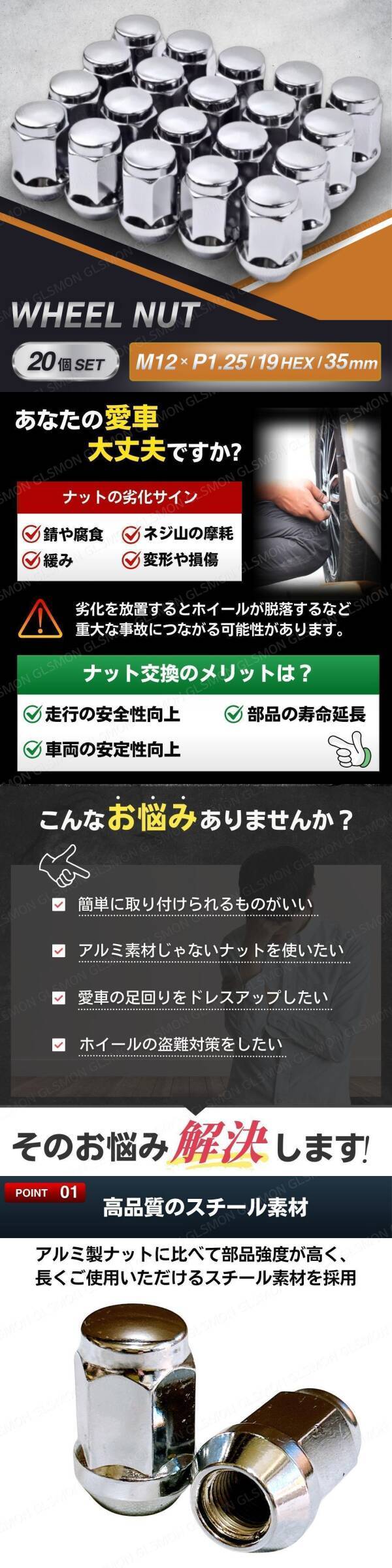 | ホイールナット M12 P1.25 19HEX 35mm 20個セット |