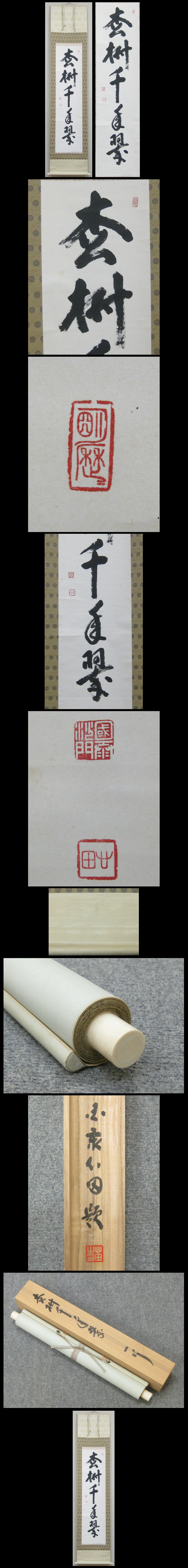 【稲葉心田】1906~1986 日本の臨済宗の僧。愛知県出身。 京都花園大学卒業後、護国寺山崎大耕の下で得度、 また天龍寺に入り関精拙に参禅。 その後、塔頭慈済院の住職を経て、国泰寺に入り、 1964年に国泰寺派元管長・僧堂師家に就任。 氷見市の野の草学園を創設、インドシナ難民救済活動などを行った事で有名。 道号は心田、法諱は元明。室号は蟠龍窟。俗姓は稲葉。 1986年、京都市で遷化。世寿81。 ★商品サイズ★ ■掛軸 211×45.5cm ■作品 130×32.5cm ★商品の状態★ 作品・表具共に少しのしみ汚れがあります。 ご承知のうえご入札をお願いします。 時代など詳しくは画像にてよく確認のうえでご検討いただければと思います。 どうぞよろしくお願いいたします。 |