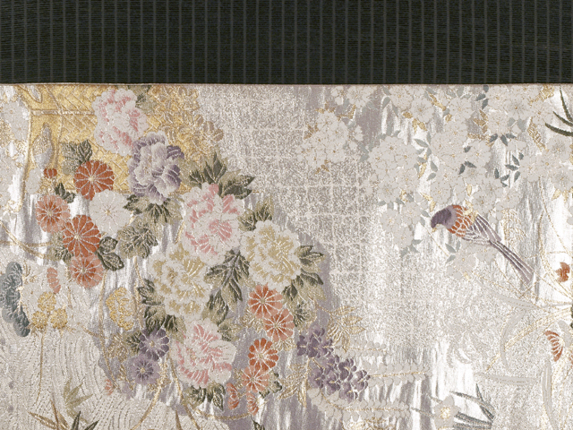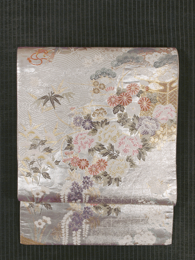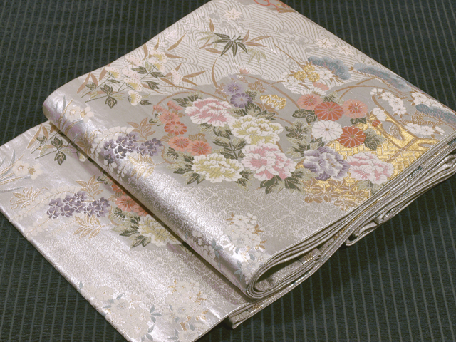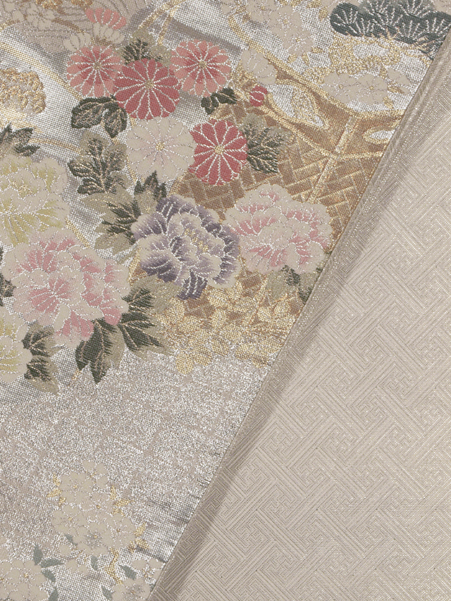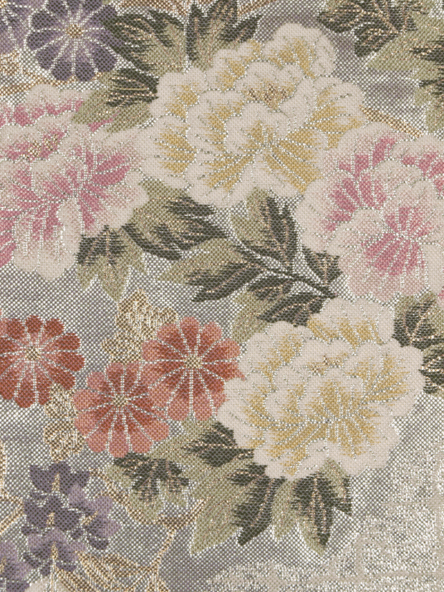 全体的な印象としては銀色の地に、道長取りでやぶれ切箔(きりはく)と立波(たつなみ)の地紋が織り出され、四季の草花の配された花車と茶屋辻の文様が織り込まれている、西陣織の袋帯です。 金銀の箔のうち金部分が控えめで、現代的な品の良いバランスの輝きを放っています。しっとりとした優美さと華やかさが感じられます。ひっそりと配された鳥にもかわいらしさが感じられます。胴回りの柄抜き部分にも紗綾形(さやがた)の地紋が織り出されています。 ユーズド品で、うっすらとした前の折り跡と結びじわがあるほか、箔糸にごくこまかな凹みがちらほらとありますが、気になるようなものではありません。目につくしみやよごれ、褪色などのダメージは見あたらず、とてもきれいな状態です。 |