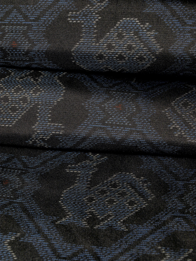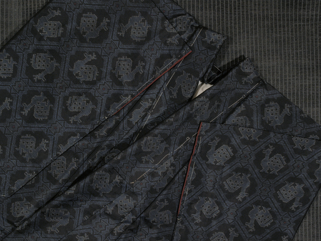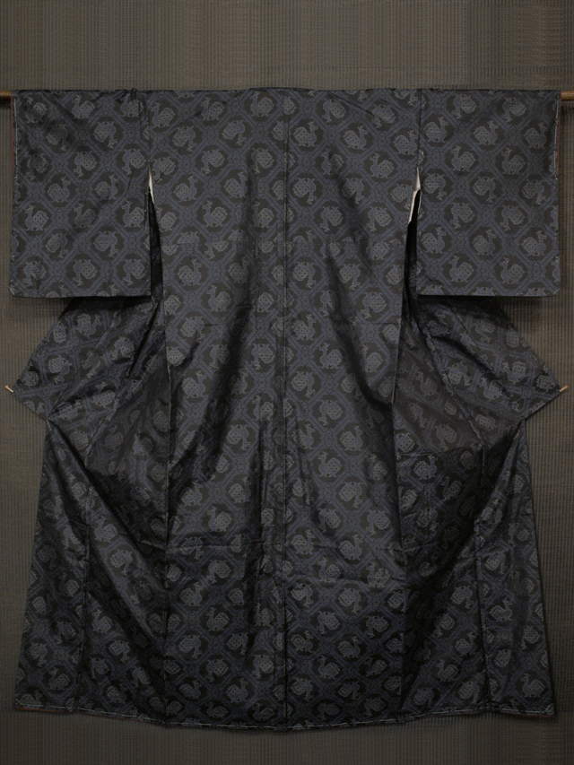 全体的な印象としては青色味のある黒色の地に、紺瑠璃(こんるり)色、白色、緋(ひ)色の絣で有栖川錦(ありすがわにしき)の文様が織り込まれている、本場大島紬です。袷仕立てです。15.5 算(よみ)の横双です。 「有栖川錦」とは、室町時代を中心に鎌倉時代から江戸時代初頭にかけて交易品としておもに中国よりもたらされ、名家や社寺などに収蔵されてきた「名物裂(めいぶつぎれ)」とよばれる染織品のうちのひとつで、鹿をはじめ、馬、龍などの動物が配された幾何学的な文様からなり、数種が存在します。大島紬にはめずらしい意匠ですね。さらりとした大島紬らしい手ざわりの地風です。 しつけ付の仕立て上がりのお品ですが、解き洗いされたユーズド品のようで、胴裏に直径約 3mm-1cm のスナップじみが数か所あるほか、後身ごろ袖付裏の胴裏に直径約 3cm のしみが 1 か所あります。そのほかに目につく大きなしみやよごれ、褪色などのダメージはなく、表地はとてもきれいな状態です。 |